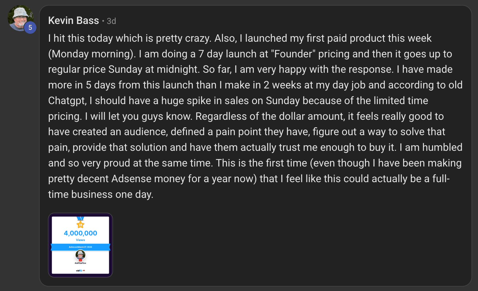 Over the lastt year, he's landed sponsorships. He's built a community. He launched his first digital product last week and made more in 7 days than he earns in two weeks at his day job.