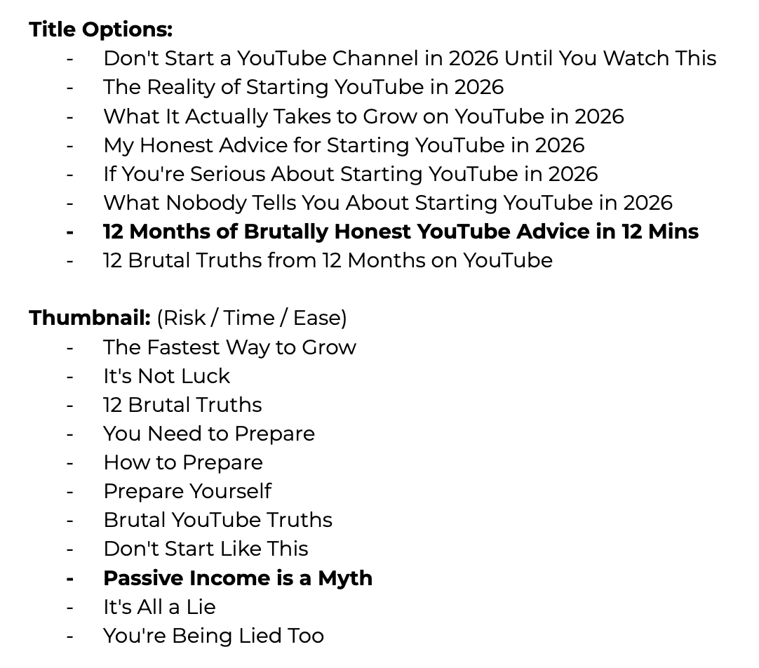 Here's what this looks like in practice. This is from my most recent video, 8 title options and 12 thumbnail caption ideas before I landed on the winner: